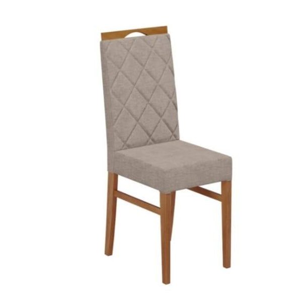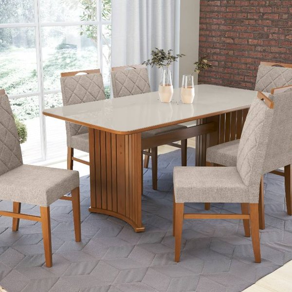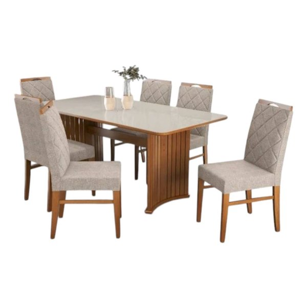 As 6 cadeiras, na cor carvalho, combinam com o tampo de vidro e apresentam encostos com um delicado desenho em losango, que adiciona um toque de modernidade e estilo ao ambiente. O assento e o encosto estofados em tecido linho proporcionam conforto durante as refeições, tornando cada momento mais agradável.