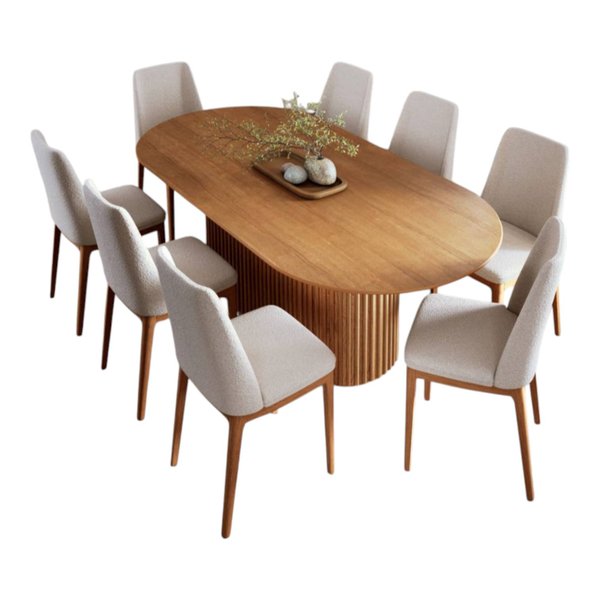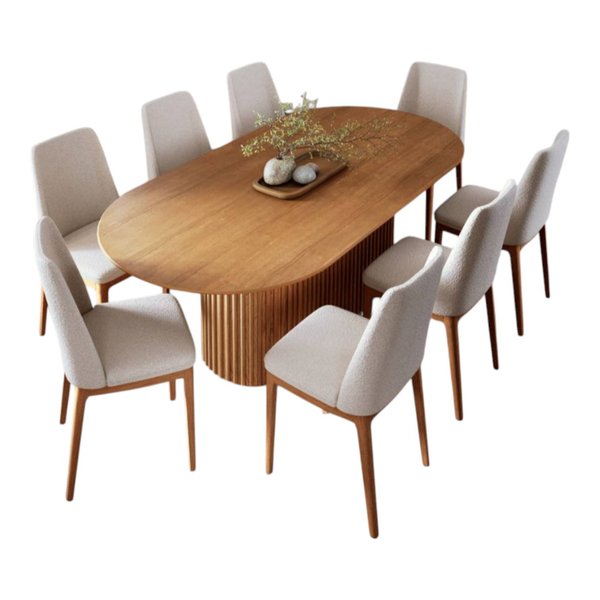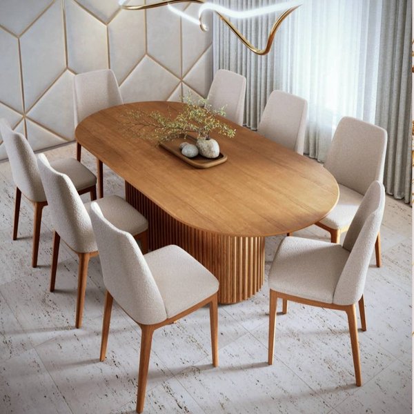 Conjunto de mesa de jantar Living com base Ripado em madeira maciça, e tampo em Lamina de Cinamomo e ripas maciças ou tampo de vidro pintado e base em MDF de 25 mm com laterais pintadas e chanfradas. Para ambientes residenciais que valorizam durabilidade e estilo.