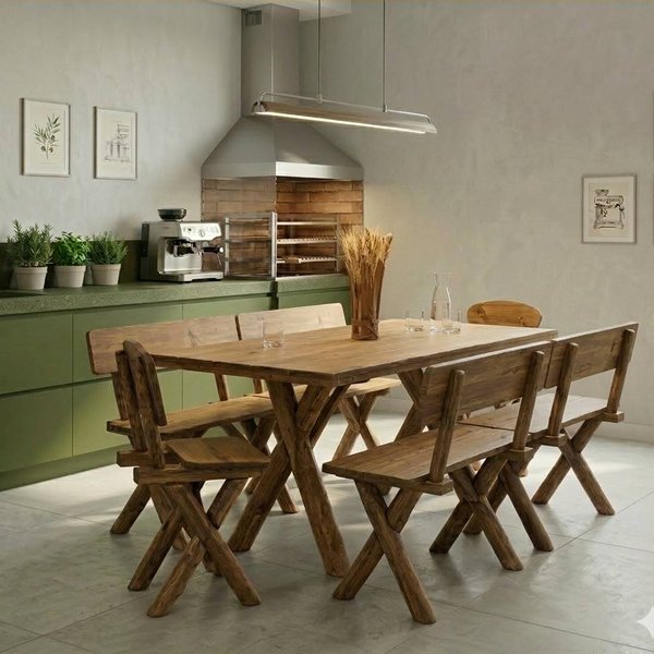 Fabricada em estilo rústico, em madeira de pinos tratado (as partes retas) e eucalipto (encostos e pés), fazem dela um estilo único que se encaixa perfeitamente com seu cantinho de churrasco.