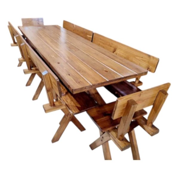 Transforme seu espaço ao ar livre com esta linda e robusta mesa para churrasco no estilo rústico, ideal para quem busca unir charme, funcionalidade e durabilidade. Com um tamanho generoso de 2,70 metros de comprimento por 0,85 metros de largura, ela oferece amplo espaço para refeições, confraternizações e momentos especiais com amigos e familiares. Acompanha 4 bancos e 2 cadeiras, proporcionando conforto e praticidade para todos os convidados, além de facilitar a organização do seu ambiente de lazer. nnFabricada com madeira, como pinos e eucalipto tratado, essa mesa foi projetada para ter durabilidade e resistência ao longo do tempo. Seu design rústico traz um toque e aconchego e autenticidade ao seu espaço, seja em uma área de churrasqueira, varanda coberta. A estética natural da madeira, combinada com o acabamento cuidadoso, faz desta mesa uma peça que valoriza qualquer ambiente ao ar livre, criando um ambiente acolhedor e convidativo para suas reuniões. nnAlém de sua beleza e resistência, essa mesa para churrasco é uma escolha inteligente para quem busca uma mobília sustentável e de fácil manutenção. Sua estrutura sólida e bem construída garante estabilidade e segurança durante o uso, enquanto o acabamento em madeira tratada facilita a limpeza e conservação. nnSe você deseja criar momentos inesquecíveis ao redor de uma mesa bonita, resistente e com um estilo que remete à natureza, essa é a escolha perfeita. Invista em uma peça que une tradição, qualidade e funcionalidade, elevando o nível do seu espaço de churrasco e proporcionando conforto para todos os seus encontros. nnDestaques do produto: nn- Tamanho ideal: 2,70m x 0,85m, perfeito para grupos grandes nn- Acompanha 4 bancos e 2 cadeiras para maior comodidade nn- Fabricada em madeira de pinos e eucalipto tratado, resistente às condições externas - Design rústico que valoriza a estética natural da madeira - Durável, fácil de limpar e de manter nn- Perfeita para áreas de churrasco, varandas, jardins e espaços ao ar livre nnTransforme seu espaço de lazer com uma peça que une beleza, resistência e funcionalidade. Aproveite para criar momentos especiais ao redor de uma mesa que combina tradição e modernidade, tudo com o charme do estilo rústico!